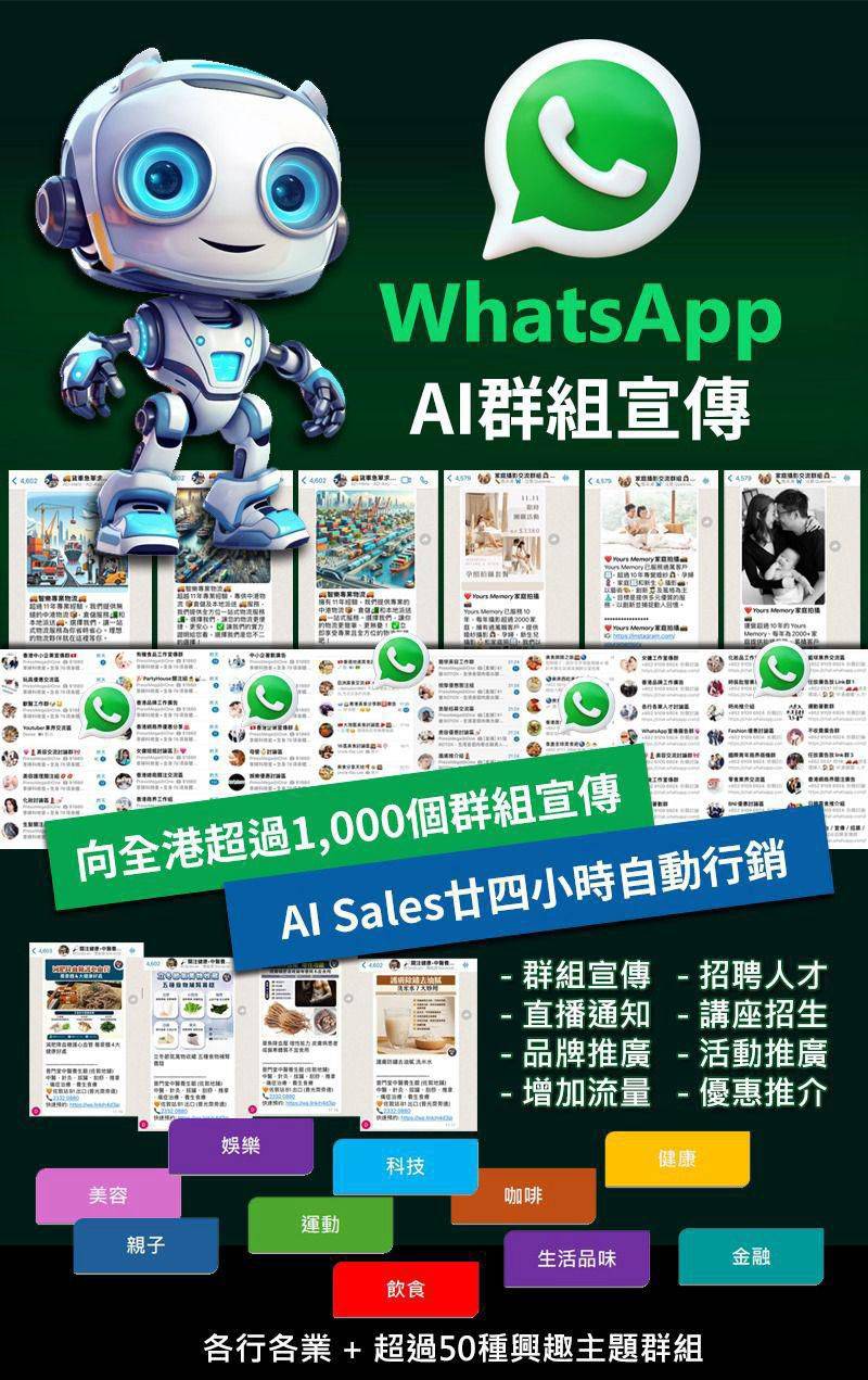 WhatsApp group marketing is the fastest way for Hong Kong SMEs to attract customers! With a 99% reach rate, we offer a database of over 1000 WhatsApp groups across Hong Kong, comprised of KOLs, bloggers, and hundreds of group administrators. Topics cover food, beauty, pets, car owner groups, mom groups, baby groups, neighborhood groups, and more, helping your brand quickly penetrate Kowloon and the New Territories, boosting your business! 🚀 Through WhatsApp group marketing, you can instantly connect with your target customers, achieving high conversion rates far exceeding traditional marketing.