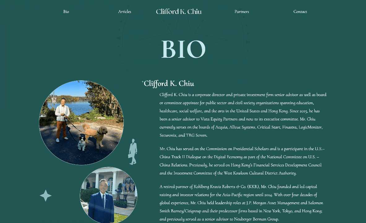 Clifford K. Chiu is a corporate director and private investment firm senior advisor as well as board or committee appointee for public sector and civil society organizations spanning education, healthcare, social welfare, and the arts in the United States and Hong Kong. Since 2015, he has been a senior advisor to Vista Equity Partners and now to its executive committee. Mr. Chiu currently serves on the boards of Acquia, Allvue Systems, Critical Start, Finastra, LogicMonitor, Securonix, and TRG Screen.