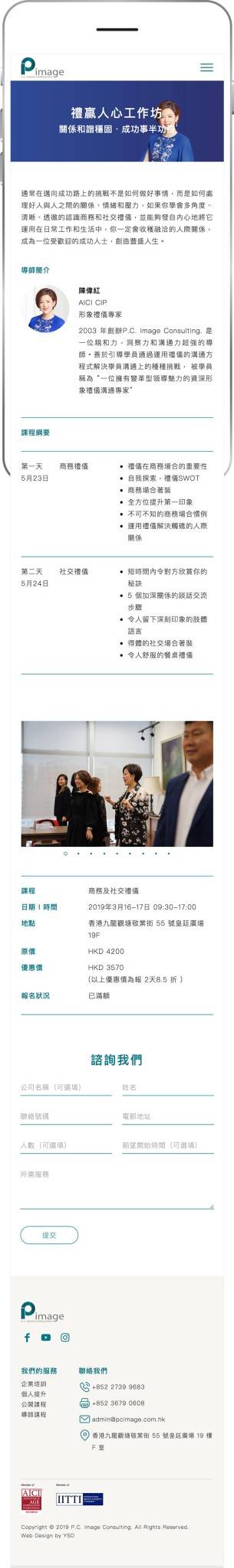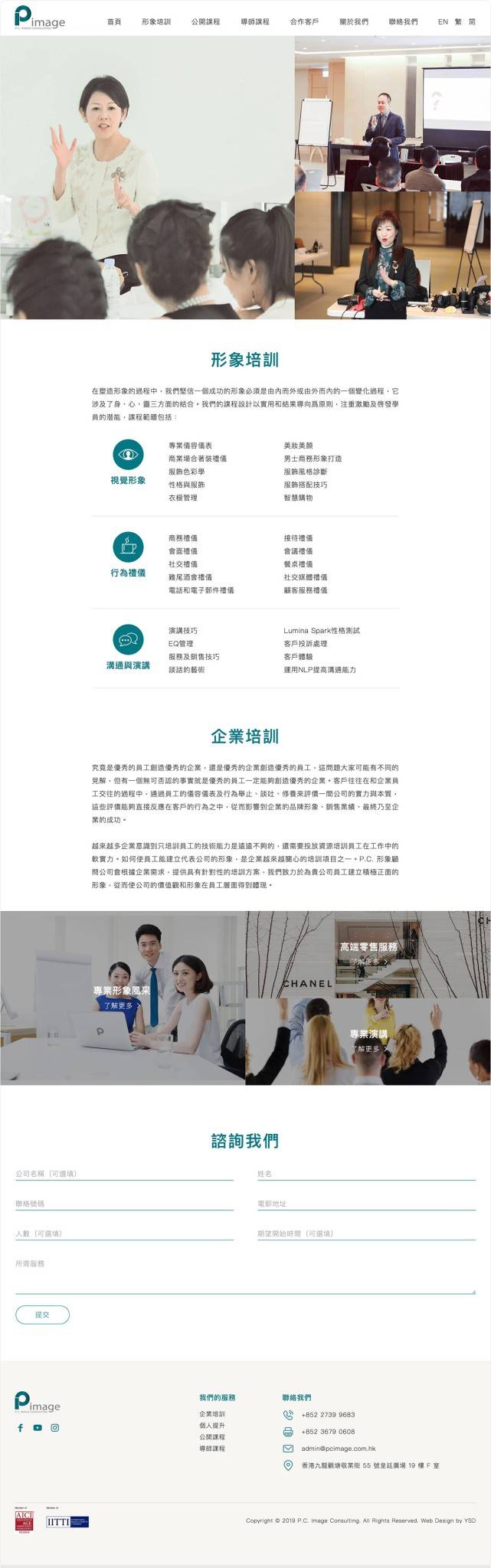 P.C. Image Consulting was founded in Hong Kong in 2003 to provide professional image, etiquette and communications services and training. For over a decade, we have serviced numerous corporate clients from various industries, including retail, financial services, properties…etc. We have accumulated extensive experience and critical acclaim. Our business footprint spans Asia Pacific – we are active in Hong Kong, Mainland China, Taiwan, South Korea, Singapore, Malaysia and Thailand. Our clients include top French luxury brand CHANEL, world’s largest insurance group AXA China, Hong Kong’s MTR Corporation Limited, China Mobile, OCBC Wing Hang Bank, Hang Lung Properties Limited…etc.