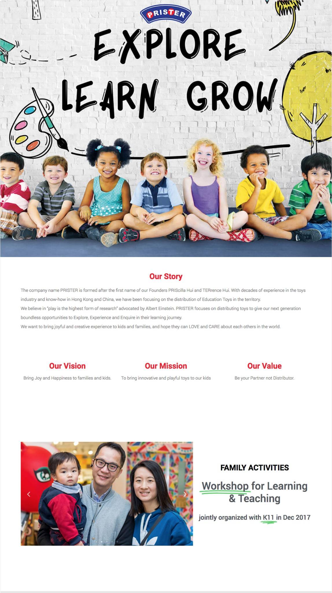 The name PRISTER is embedded with the names of the founders Ms. PRIScilla Hui and Mr. TERrence Hui. The two founders were born into a toy factory family. Their parents produced a series of innovative educational toys, so they often had to test different toys.