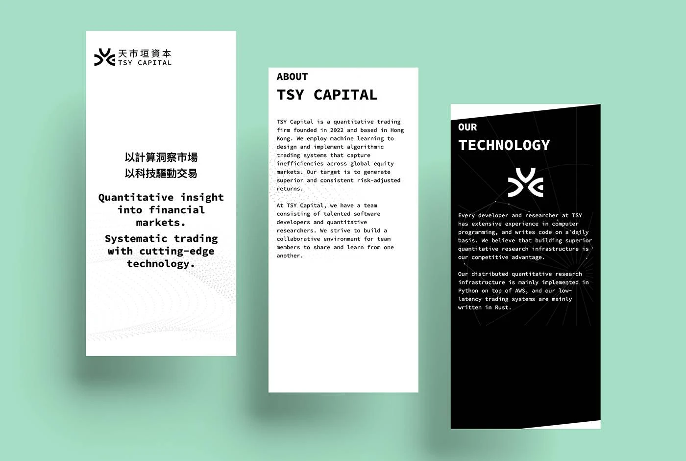 TSY Capital is a quantitative trading firm founded in 2022 and based in Hong Kong. We employ machine learning to design and implement algorithmic trading systems that capture inefficiencies across global equity markets. Our target is to generate superior and consistent risk-adjusted returns.